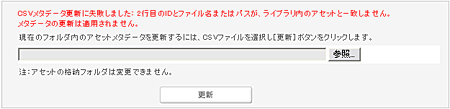CSVメタデータ更新に関しては、次の場合にエラー画面が表示されます。CSVファイルを編集して再選択するなど必要な操作を行ってください。