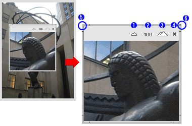 リサイズコーナー: 各四隅及びボーダーをドラッグしてウィンドウをリサイズします。画像の拡大率は保持されます。