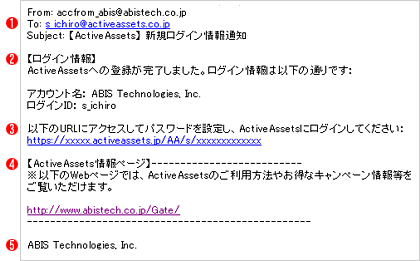 ActiveAssetsにログイン(ユーザ・ゲスト)を作成すると、ログイン情報を通知する電子メールが送信されます。