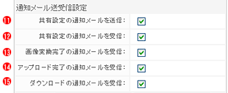 共有を受け受信先になっている場合の、共有通知メールの受信を設定します。デフォルト値: オン