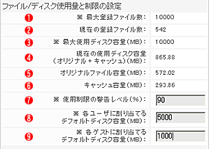 このアカウントに許可された最大登録ファイル数。アカウント作成時にシステム管理者が設定します。 |