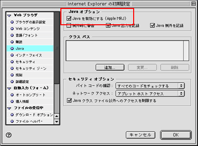 Note: チェックを入れた時に、メッセージが表示されチェックを設定できない場合は、Javaプラグイン(MRJ)がインストールされていません。Javaプラグインのインストールでインストールを行ってください。