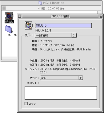 「MRJLib」アイコンをシングルクリックし、「ファイル」メニュー→「情報を見る」で「MRJLib情報」を開く。
