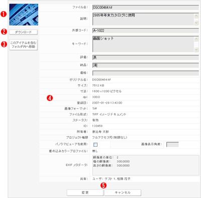 プロジェクトアセットから、アセットの情報(= メタデータ)へアクセスが可能です。共有及びディレクトリ(ファイル位置)以外は、オリジナルアセット情報の参照となります。
