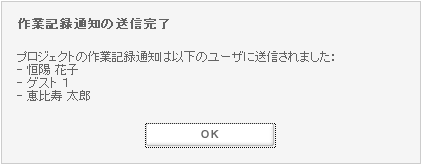 プロジェクト作業記録は電子メールとして、自動であるいは任意でメンバーに送信されます。任意の場合は編集が可能で、作業記録を含まない設定にすることにより、プロジェクトメンバーへの一般通知機能としても使用できます。