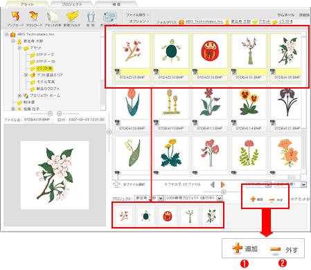 Note: ビューエリアツールバーのツール(ダウンロード・コピーなど)は、プロジェクトプレビューエリアに追加したサムネールの選択に対しては行うことができません。ビューエリアのサムネールを選択してください。
