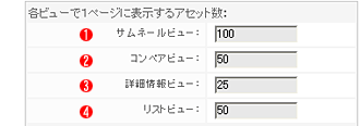 詳細情報ビュー:  詳細情報ビュー選択時にビューエリアに表示するアセット数。デフォルト値:25