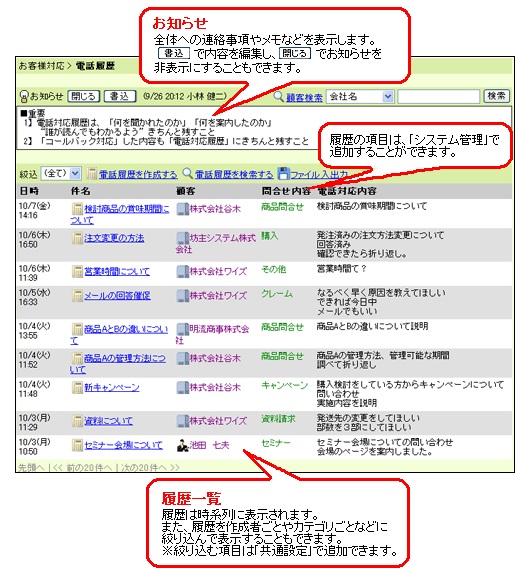 「電話履歴」は、電話での問い合わせやその回答などを記録しておくアプリケーションです。 「訪問履歴」は、お客様との打ち合わせや訪問の履歴を作成することで、同じ顧客との過去のやり取りを閲覧することができるアプリケーションです。 履歴は顧客ごとに管理され、履歴の項目を「システム管理」 より設定することもできます。