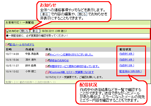 「一斉配信」は、顧客管理に登録されている顧客やCSVファイルを使って、簡単に複数の宛先にメールを送信できるアプリケーションです。 ※送信するメールは、それぞれ別のメールとして宛先に送信されます。