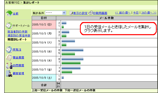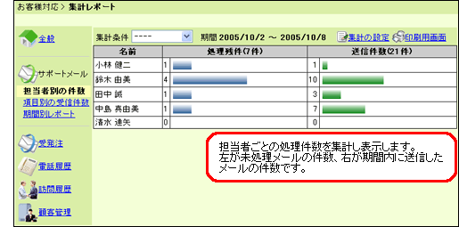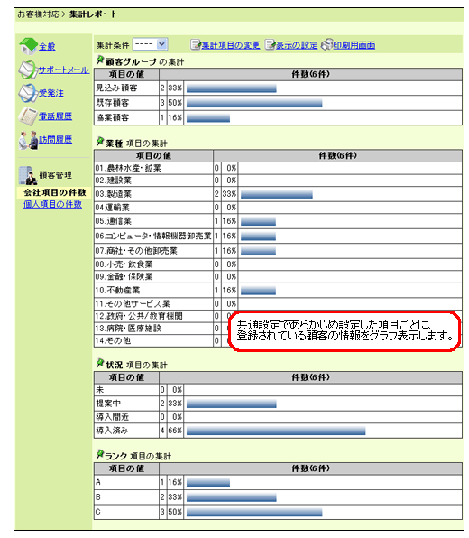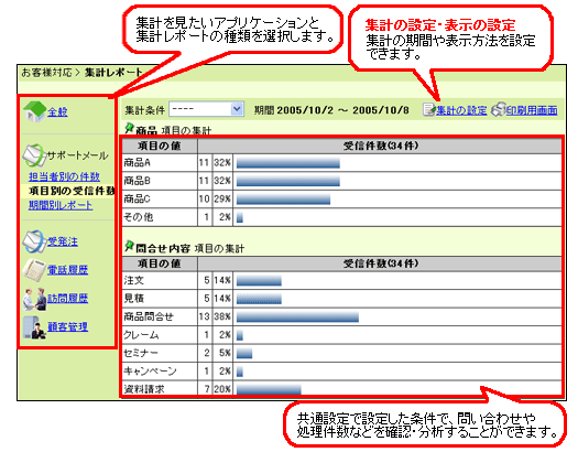 「集計レポート」は、問い合わせの傾向や、担当者ごとや期間ごとの処理件数、会社や個人顧客の項目などを集計できるアプリケーションです。 集計の期間や表示の設定は、一覧画面の 集計の設定 や、 表示の設定 からおこなえます。 また、各アプリケーションの集計条件の設定は、共通設定の各アプリケーションの「集計条件」からおこなってください。